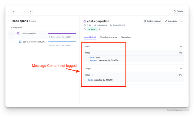 Set litellm.turn_off_message_logging=True This will prevent the messages and responses from being logged to your logging provider, but request metadata - e.g. spend, will still be tracked. Useful for privacy/compliance when handling sensitive data.